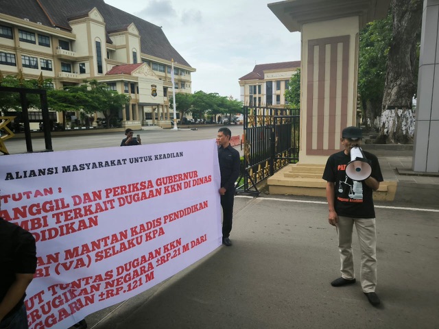 Tajam24Jam.Com Jambi, 9 Desember 2025 – Memanfaatkan momentum Hari Antikorupsi Sedunia (09/12/2025), Aliansi Masyarakat Untuk Keadilan (AMUK) kembali menggelar aksi unjuk rasa damai di depan pintu gerbang Mapolda Jambi. Massa yang dipimpin Ketua AMUK, Husnan, mendesak penyidik Ditreskrimsus Tipikor Polda Jambi segera memanggil dan memeriksa Gubernur Jambi Al-Haris terkait dugaan praktik KKN di Dinas Pendidikan Provinsi Jambi.