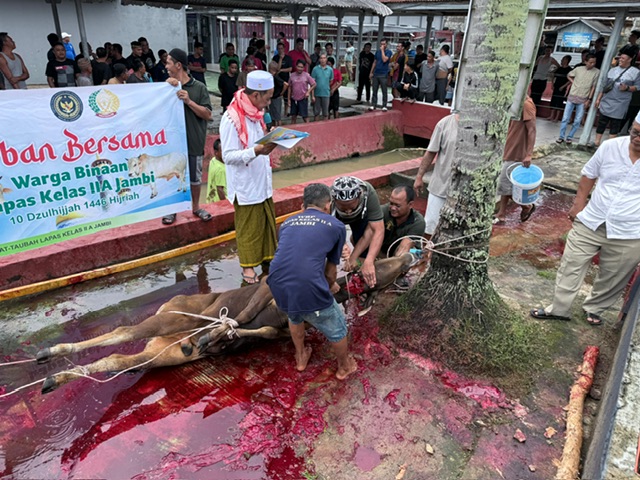 Tajam24Jam.Com Jambi, Juma’t 6/6/2025 — Dalam rangka menyambut Hari Raya Idul Adha 1446 Hijriah, Lembaga Pemasyarakatan (Lapas) Kelas IIA Jambi melaksanakan kegiatan pemotongan hewan kurban sebagai wujud kepedulian sosial dan penguatan silaturahmi dengan masyarakat.