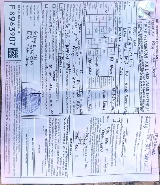 Penindakan tersebut dilakukan oleh personel Unit Patroli Jalan Raya (PJR) Direktorat Lalu Lintas Polda Jambi pada Senin, 24 Februari 2026, sekitar pukul 10.00 WIB, di ruas jalan wilayah Muaro Jambi. Berdasarkan bukti pelanggaran lalu lintas yang diterbitkan petugas, kendaraan yang dikemudikan Doni merupakan truk Hino dengan nomor polisi BG 8544 MH.