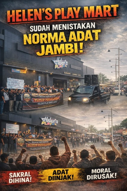 Tajam24Jam.Com Jambi, 31 Desember 2025 – ALAT JITU atau Aliansi Masyarakat Adat Melayu Jambi Bersatu adalah kumpulan dari beberapa lembaga dan Ormas di Jambi yg tergabung dalam satu pemahaman dan satu pandangan di dalam menyikapi persoalan2 sosial lingkungan masyarakat Jambi, adapun masalah yg sa’at ini menjadi perhatian ALAT JITU berkenaan dengan sebuah badan usaha swasta hiburan malam, dengan konsep hiburan anak muda mudi, adapun juga tempat Hiburan Malam itu menyuguhkan minuman beralkohol, tempat itu berlabel HELEN’S PLAY MART (HPM), Aktivitas usaha tersebut di nilai berdamapak negatif bagi masyarakat generasi muda bangsa dan anak negeri.