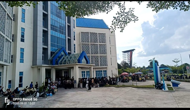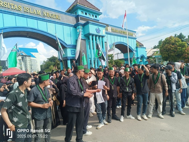 Tajam24Jam.Com Jambi, 1 September 2025 – Himpunan Mahasiswa Islam (HMI) Cabang Jambi menggelar aksi damai di depan kampus Universitas Islam Negeri (UIN) Sulthan Thaha Saifuddin (STS) Jambi pada Senin (1/9/2025). Aksi ini digelar sebagai bentuk kekecewaan atas dugaan intimidasi serta penganiayaan yang dialami kader HMI di lingkungan kampus.