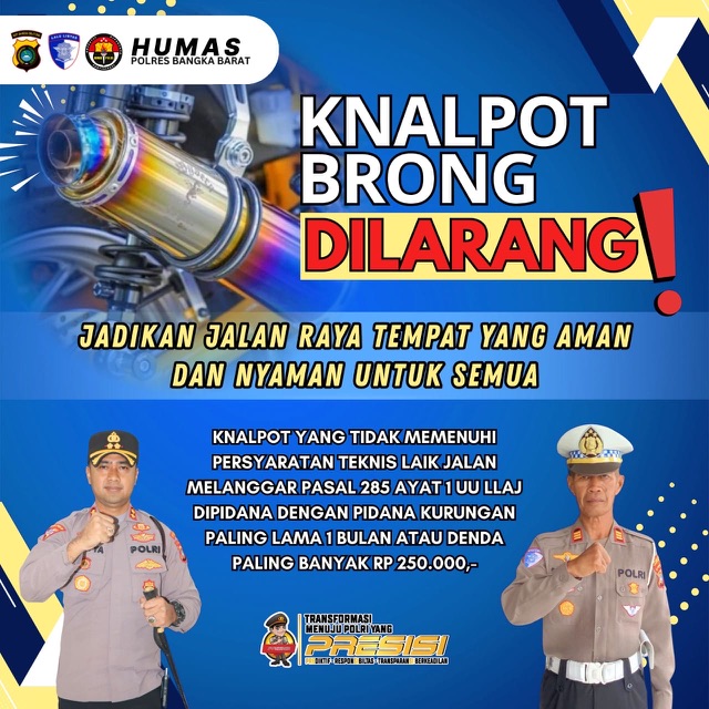 Tajam24Jam.Com Bangka Barat, 20 Agustus 2025 – Dalam upaya menjaga ketertiban dan kenyamanan masyarakat, Kapolres Bangka Barat, AKBP Pradana Aditya Nugraha, S.H., S.I.K., kembali mengeluarkan himbauan kepada masyarakat, khususnya para pengendara sepeda motor, untuk tidak menggunakan knalpot brong atau knalpot modifikasi yang menghasilkan suara bising.
