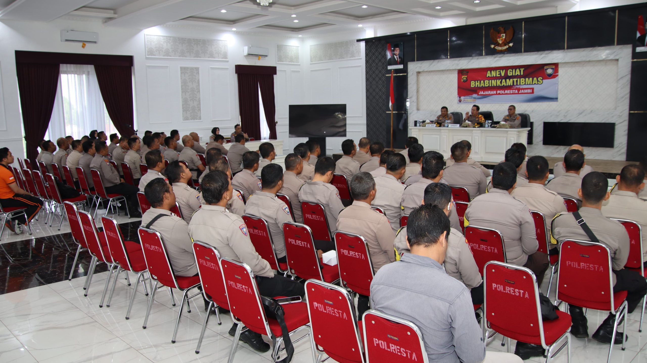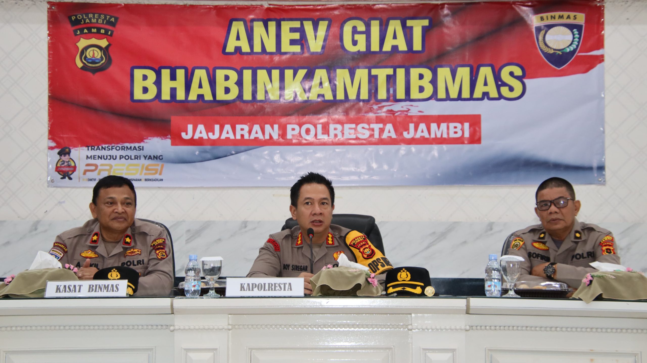 Kegiatan Anev Bhabinkamtibmas bersama Polsek jajaran Polresta Jambi tersebut dipimpin langsung oleh Kapolresta Jambi Kombes Pol Boy Sutan Binanga Siregar, S.I.K, M.H didampingi Kabag SDM Kompol Sopirin, S.H dan Kasat Binmas Kompol Abdul Akil, S.H serta dihadiri oleh; KBO Sat Binmas Polresta Jambi Ipda Wira Aswita Guci, S.H. Kanit Bintibsos Satbinmas Ipda Herbudi. Kanit Bhabinkamtibmas Satbinmas Ipda Syahrial. Kanit Binkamsa Satbinmas Ipda Tegu Budi Santoso. Para Kanit Binmas Polsek jajaran Polresta Jambi dan para Bhabinkamtibmas Polsek jajaran Polresta Jambi.