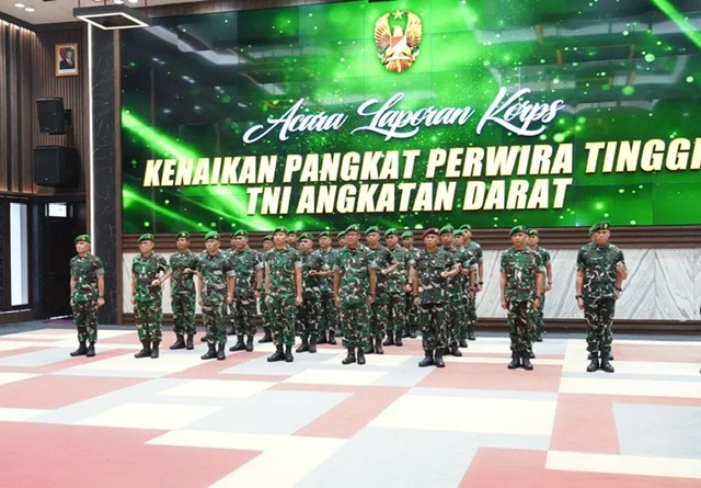 Sebanyak 28 Perwira Tinggi TNI AD melaksanakan laporan korps atas kenaikan pangkat satu tingkat lebih tinggi dalam suasana sederhana namun khidmat. Komposisinya terdiri dari satu perwira naik menjadi Letjen TNI, tujuh perwira menjadi Mayjen TNI, dan 20 perwira menjadi Brigjen TNI.
