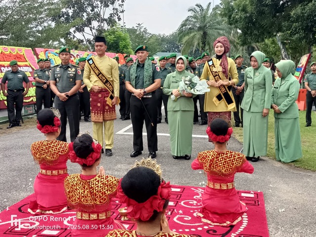 Tradisi penyambutan adat Jambi berupa tarian sekapur sirih dan pedang Pora serta pengalungan syal kepada Dandim 0415/Jambi yang baru beserta Istri.