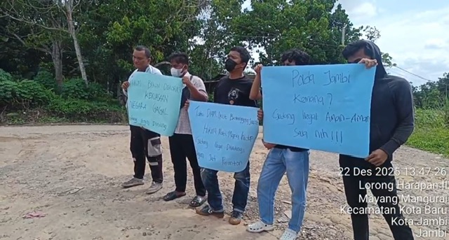 Aksi unjuk rasa digelar secara langsung di depan gudang penimbunan BBM ilegal yang berada di Jalan Lingkar Barat, Kecamatan Kota Baru, Kota Jambi, sebagai bentuk protes keras terhadap lemahnya penegakan hukum atas maraknya praktik ilegal yang diduga berlangsung terang-terangan.