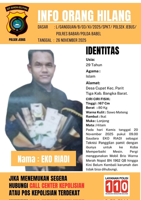 Tajam24Jam.Com Bangka Barat, 26 November 2025 – Polres Bangka Barat melalui Polsek Jebus bergerak cepat menindaklanjuti laporan hilangnya Eko Riadi, warga Desa Cupat Kecamatan Jebus, yang tidak pulang sejak Kamis, 20 November 2025. Laporan resmi disampaikan keluarga pada Rabu (26/11/2025) setelah korban tidak dapat dihubungi maupun ditemukan keberadaannya.