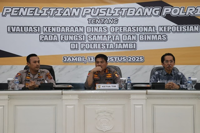 Tajam24Jam.Com Jambi, 13 Agustus 2025 — Polresta Jambi menerima kunjungan Tim Pusat Penelitian dan Pengembangan (Puslitbang) Polri dalam rangka penelitian bertajuk “Evaluasi Kendaraan Dinas Operasional Kepolisian pada Fungsi Samapta dan Binmas di Satuan Kewilayahan”. Kegiatan berlangsung di Aula Lokamanginti Mapolresta Jambi.