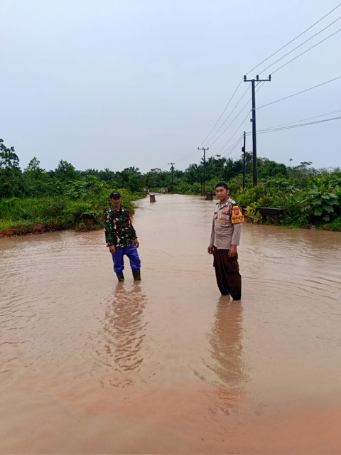 Personel Polsek Jebus Polres Bangka Barat bersama Bhabinkamtibmas, perangkat desa, TNI, dan relawan masyarakat melakukan pengecekan dan penanganan di sejumlah titik kritis: