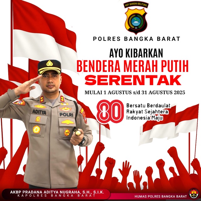 Tajam24Jam.Com Bangka Barat, 2 Agustus 2025 – Menjelang peringatan Hari Ulang Tahun Republik Indonesia (HUT RI) ke-80 pada 17 Agustus 2025, Kapolres Bangka Barat AKBP Pradana Aditya Nugraha, S.H., S.I.K. mengajak seluruh masyarakat di Bangka Barat untuk mengibarkan bendera Merah Putih mulai tanggal 1 Agustus 2025.