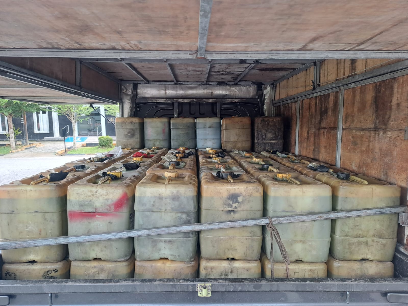 Barang bukti yang diamankan berupa 92 (Sembilan Puluh Dua) Jerigen ukuran 20 Liter, 1 (Satu) unit Mobil Daihatsu Pick Up Warna Abu-Abu Metalik beserta STNK,3 (Tiga) Buah Corong Pelastik.