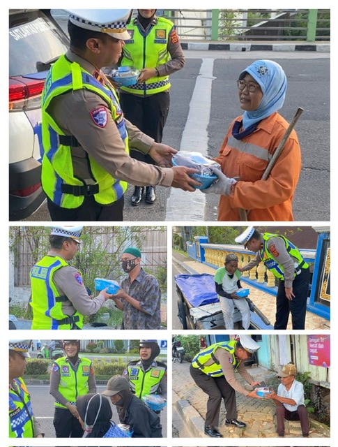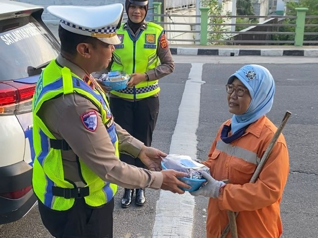 Selain berbagi, personel Satlantas juga turut menyampaikan imbauan kepada para pengendara agar selalu tertib berlalu lintas serta mengutamakan keselamatan di jalan.