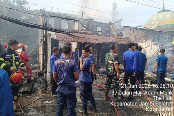 Tajam24Jam.Com JAMBI, 21 Januari 2026 — Kebakaran hebat melanda kawasan Jalan Adam Malik, Kelurahan Thehok, Kecamatan Jambi Selatan, Rabu (21/1/2026) sekitar pukul 14.30 WIB. Peristiwa tersebut mengakibatkan tiga unit rumah toko (ruko) hangus terbakar dan satu orang dilaporkan meninggal dunia. Berdasarkan keterangan di lapangan, api dengan cepat membesar dan melalap bangunan ruko yang berada di lokasi kejadian. Warga sekitar sempat berupaya memberikan pertolongan awal sebelum petugas pemadam kebakaran tiba di tempat kejadian perkara (TKP). Untuk memadamkan kobaran api, Dinas Pemadam Kebakaran dan Penyelamatan Kota Jambi mengerahkan sebanyak enam unit mobil pemadam. Petugas melakukan penanganan intensif guna mengendalikan api agar tidak merembet ke bangunan lain di sekitarnya. Setelah berjibaku selama beberapa waktu, api berhasil dikendalikan. Petugas kemudian melanjutkan proses pendinginan untuk memastikan tidak ada lagi titik api yang berpotensi memicu kebakaran lanjutan. Hingga berita ini diturunkan, penyebab kebakaran masih dalam penyelidikan pihak berwenang. Selain itu, pendataan kerugian material serta identitas korban meninggal dunia juga masih dilakukan.Aparat kepolisian telah mengamankan lokasi kejadian guna kepentingan penyelidikan lebih lanjut. Penulis Tim