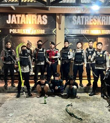 Tajam24Jam.Com Jambi, Senin 19/5/2025 – Tiga remaja laki-laki terduga anggota geng motor bersenjata tajam diamankan oleh Tim Serigala Kota Polresta Jambi dalam patroli malam pada Sabtu 18 Mei 2025 kemarin. Ketiganya diringkus di kawasan Kenali Besar, Kecamatan Alam Barajo, setelah petugas menerima laporan masyarakat soal keberadaan sekelompok pemuda yang membawa senjata tajam. Patroli yang dimulai pukul 23.34 WIB tersebut diawali dengan apel kesiapan di Mapolsek Jelutung, dipimpin oleh Kanit Turjawali Iptu Galumbang Simaremare, dan melibatkan 10 personel. Kasi Humas Polresta Jambi, Ipda Deddy mengatakan, penindakan ini merupakan respons cepat kami terhadap aduan masyarakat. “Tiga orang berhasil diamankan bersama sejumlah senjata tajam, dan saat ini sudah kami serahkan ke Satreskrim Polresta Jambi untuk proses hukum lebih lanjut,” katanya, Senin (19/05/2025). Ketiga remaja yang diamankan diketahui berinisial R (16), RS (17), dan RD (17). Mereka diduga tergabung dalam kelompok geng motor yang aktif di media sosial dengan akun seperti @gerot_famili, @pbm.03boys, dan @generation21kamsoet. Selain mengamankan para remaja, petugas menyita sejumlah barang bukti berupa 2 bilah egrek panjang, 2 bilah celurit panjang, 1 bilah celurit pendek, 1 bilah corbek panjang, 1 bilah stik golf, 1 gergaji besi,1 batang besi panjang serta 1 unit sepeda motor dan 2 unit handphone. Dari hasil interogasi awal, para pelaku mengaku baru saja terlibat tawuran sebelum kembali ke markas mereka dan akhirnya tertangkap di depan Masjid Suhada oleh Tim Serigala Kota yang tengah berpatroli. Selain penangkapan tersebut, patroli yang menyisir wilayah Kecamatan Jambi Selatan, Alam Barajo, dan Telanaipura itu juga melakukan antisipasi balap liar, tawuran, dan tindak kejahatan 3C (curat, curas, dan curanmor) di sejumlah titik rawan seperti Sungai Putri dan Jalan Kol. Pol M. Thaher. “Kami terus mengajak peran serta masyarakat untuk aktif menjaga situasi kamtibmas. Pengawasan terhadap anak-anak, khususnya pada malam hari, juga sangat penting,” tambah Ipda Deddy. Penulis Tim