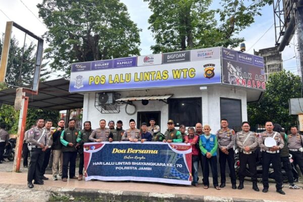 Tajam24Jam.Com Jambi, 19 September 2025 – Satuan Lalu Lintas (Sat Lantas) Polresta Jambi melaksanakan kegiatan doa bersama dengan komunitas ojek online (ojol) dalam rangka memperingati Hari Lalu Lintas Bhayangkara ke-70. Acara ini digelar di Pos WTC, Jalan Sultan Thaha No.17, Kecamatan Pasar, Kota Jambi, Jumat (19/9) pagi. Kegiatan yang dimulai pukul 08.00 WIB ini dihadiri langsung oleh Kasat Lantas Polresta Jambi, Wakasat Lantas, serta jajaran anggota Sat Lantas. Kasat Lantas Polresta Jambi dalam keterangannya menyampaikan bahwa doa bersama ini menjadi wujud kebersamaan antara kepolisian dengan masyarakat, khususnya para pengemudi ojol. Hari Lalu Lintas ke-70 ini kami jadikan momentum untuk mempererat tali silaturahmi. Semoga hubungan baik Polantas dan komunitas ojek online terus terjalin, dan lalu lintas di Kota Jambi semakin aman, tertib, serta harmonis,” ujarnya. Selain doa bersama, kegiatan ini juga menjadi ruang silaturahmi yang diharapkan mampu memperkuat komunikasi antara polisi lalu lintas dan para pengemudi ojol. Adapun hasil yang dicapai dalam kegiatan ini, yakni terjalinnya hubungan yang lebih akrab dengan komunitas ojek online serta meningkatnya citra positif Polantas di tengah masyarakat. Penulis Tim