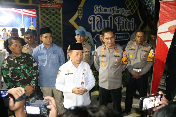 Tajam24Jam.Com Jambi, 30/3/2025 – Kapolda Jambi Irjen Pol. Krisno Halomoan Siregar bersama Gubernur Jambi H. Al-Haris dan Forkopimda Jambi melaksanakan pengecekan Pos Pengamanan Lebaran 2025 pada Minggu, (30/03/2025). Pengecekan tersebut dilaksanakan di pos pengamanan yang berada di depan Exit Tol Muaro Sebapo, Kecamatan Mestong, Kabupaten Muaro Jambi pada saat malam takbiran jelang hari raya Idul Fitri 1446 Hijriah. Sebelum dilaksanakannya pemantauan dilakukan zoom meeting terlebih dahulu bersama Kapolri Jenderal Listyo Sigit Prabowo terkait situasi Kamtibmas di malam takbiran di masing – masing wilayah. Kapolda Jambi menyampaikan bahwa kegiatan pemantauan keamanan malam takbiran Idul fitri 1446 H ini, untuk memastikan situasi kamtibmas saat malam takbiran di wilayah Jambi dalam keadaan kondusif. “Situasi Kamtibmas di wilayah Jambi dalam keadaan kondusif, kita berharap semoga hingga Idul Fitri nanti situasi Kamtibmas tetap terjaga sehingga masyarakat bisa aman,nyaman dan damai selama Hari Raya Idul Fitri” Kapolda Jambi. Diakhir kegiatan, Kapolda Jambi memberikan bingkisan kepada para personel yang bertugas di pos pengamanan. Kapolda Jambi berharap para personel pengamanan dapat bertugas dengan baik dan penuh semangat serta dapat layani masyarakat dengan maksimal. Penulis Team