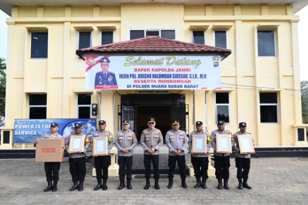 Tajam24Jam.Com Jambi, 27 September 2025 – Kapolda Jambi Irjen Pol. Krisno H. Siregar memberikan penghargaan kepada lima personel Bhabinkamtibmas berprestasi sekaligus menyerahkan sarana dan prasarana pelayanan masyarakat di Polsek Sabak Barat, Sabtu (27/9/2025). Penghargaan diberikan kepada Aipda Andri Agus, Aipda Dapit Erikmen Sitohang, Bripka Muhammad Fajri, Aiptu Andy Farja Simatupang, dan Aipda Eko Bayu Kusumantoro atas dedikasi serta pengabdian mereka dalam melayani masyarakat di wilayah binaan. Selain itu, Kapolda Jambi juga menyerahkan bantuan satu unit komputer untuk mendukung pelayanan SPKT Polsek Sabak Barat yang diterima langsung oleh Aipda Heri Susanto mewakili Kapolsek Sabak Barat. “Bhabinkamtibmas adalah ujung tombak Polri di tengah masyarakat. Penghargaan ini bukan hanya simbol, tetapi motivasi agar seluruh personel semakin bersemangat memberikan pelayanan terbaik,” tegas Kapolda Jambi dalam sambutannya. Usai kegiatan, Kapolda Jambi bersama rombongan melanjutkan agenda menuju Panen Raya Jagung Kuartal III di Dusun Sidodadi, Desa Suka Maju, Kecamatan Geragai, Kabupaten Tanjab Timur. Turut hadir dalam kegiatan tersebut Wakapolda Jambi Brigjen Pol. M. Mustaqim, Irwasda Polda Jambi Kombes Pol. Jannus Parlindungan Siregar, Pejabat Utama Polda Jambi, Kapolres Tanjab Timur AKBP Maulia Kuswicaksono, serta jajaran Polres dan Polsek setempat. Penulis Tim