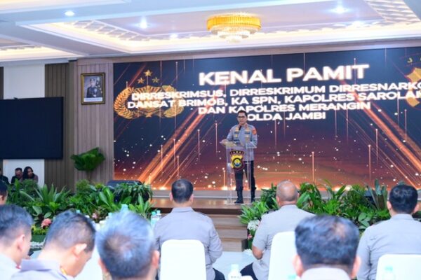Tajam24Jam.Com Jambi, 10 Juli 2025 — Kepolisian Daerah (Polda) Jambi menggelar acara Kenal Pamit Pejabat Utama (PJU) dan Kapolres jajaran Polda Jambi yang berlangsung khidmat di Aula Lantai 3 Gedung Siginjai, Kamis (10/07/2025). Acara tersebut dihadiri langsung oleh Kapolda Jambi Irjen Pol. Krisno H. Siregar, didampingi Wakapolda Brigjen Pol. M. Mustaqim, Irwasda Kombes Pol. Jannus Parlindungan Siregar, Ketua Bhayangkari Daerah Jambi Ny. Evi Krisno Siregar, serta para pejabat utama dan Kapolres jajaran beserta Bhayangkari dan personel yang ditunjuk. Rangkaian kegiatan dimulai dengan pembukaan, doa bersama, pemutaran video profil pejabat baru, sambutan perkenalan, serta penayangan video perjalanan pejabat lama. Acara kemudian dilanjutkan dengan penyampaian kesan dan pesan, penyerahan cinderamata, dan sambutan dari Kapolda Jambi. Dalam sambutannya, Irjen Pol. Krisno H. Siregar menyampaikan apresiasi dan ucapan terima kasih kepada pejabat yang telah mengakhiri masa tugasnya di Polda Jambi. Meskipun kebersamaan kita baru sebentar di Provinsi Jambi, namun sangat berkesan bagi saya. Kepada pejabat lama saya ucapkan selamat jalan dan semoga sukses di tempat penugasan yang baru. Dan kepada pejabat baru, selamat datang dan bergabung di Polda Jambi,” ujar Kapolda Jambi. Kapolda juga mengajak para pejabat baru untuk segera beradaptasi dengan lingkungan tugas dan mendukung program Polri Presisi yang humanis dan profesional. Selain itu, Kapolda menyampaikan pesan khusus kepada para ibu Bhayangkari agar tetap setia mendampingi dan mendukung suami dalam menjalankan tugas negara. Pesan saya kepada ibu Bhayangkari agar mendukung tugas yang dilaksanakan oleh para suami dimanapun bertugas, karena peran Bhayangkari sangat penting dalam keluarga,” tambahnya. Acara berlangsung hangat dan penuh keakraban sebagai simbol soliditas serta komitmen kuat dalam menjaga stabilitas dan pelayanan kepada masyarakat Jambi. Penulis Tim