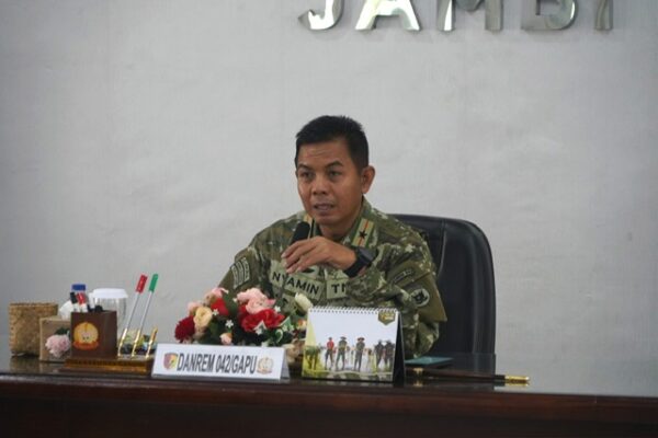Tajam24Jam.Com Jambi, 6 Maret 2026 – Korem 042/Gapu menggelar peringatan Nuzulul Quran 17 Ramadhan 1447 H/2026 M di Masjid At-Taqwa Korem 042/Gapu, yang dihadiri langsung oleh Danrem 042/Gapu Kolonel Inf Nyamin, S.I.P., M.M., para Pejabat Utama Korem, Ketua Persit KCK Koorcab Rem 042 PD XX/TIB beserta pengurus, dalam suasana khidmat dan penuh kebersamaan di bulan suci Ramadan, Jum’at (6/3/2026). Kegiatan tersebut mengusung tema “Ramadhan Membentuk Mental Prajurit TNI yang Prima dan Memegang Teguh Nilai-nilai Tauhid untuk Indonesia Maju”. Tema ini menjadi pengingat pentingnya membangun kekuatan spiritual sebagai landasan moral bagi setiap prajurit dalam melaksanakan tugas pengabdian kepada masyarakat, bangsa dan negara. Dalam kesempatan tersebut, Danrem 042/Gapu menyampaikan bahwa peringatan Nuzulul Quran bukan sekadar kegiatan seremonial, melainkan sarana untuk memperdalam pemahaman dan pengamalan nilai-nilai Al-Quran. “Melalui momentum peringatan Nuzulul Quran ini, saya mengajak seluruh prajurit, PNS, serta keluarga besar Korem 042/Gapu untuk senantiasa meningkatkan keimanan dan ketakwaan kepada Allah SWT,” ujar Danrem. Kegiatan peringatan Nuzulul Quran tersebut juga diisi dengan tausiyah keagamaan oleh ustadz H. M. Thohir, M.Pdi., yang mengajak seluruh jamaah untuk semakin mendekatkan diri kepada Allah SWT serta menjadikan Al-Quran sebagai pedoman dalam kehidupan sehari-hari. Dengan adanya kegiatan ini, diharapkan seluruh prajurit, PNS, dan keluarga besar Korem 042/Gapu dapat semakin memperkokoh keimanan dan memperkuat semangat pengabdian, sehingga mampu menjalankan tugas dengan profesional serta memberikan kontribusi terbaik bagi kemajuan bangsa dan negara. (Penrem 042/Gapu) Penulis Tim