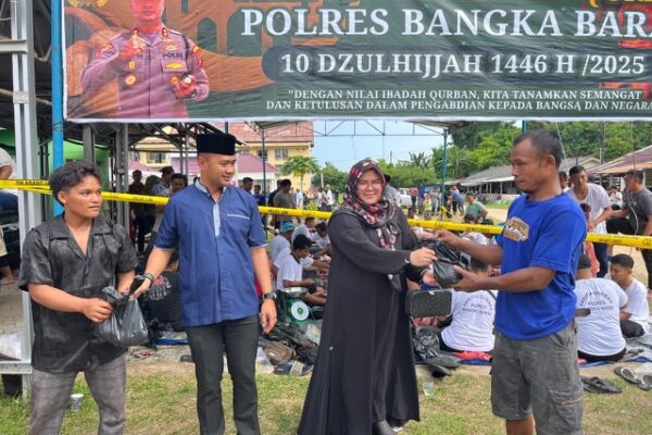 Tajam24Jam.Com Bangka Barat, Jum’at 6/6/2025 – Dalam rangka memperingati Hari Raya Idul Adha 1446 Hijriah, Polres Bangka Barat melaksanakan kegiatan pemotongan hewan kurban yang dipusatkan di Mapolsek Mentok, pada Jumat (6/6/2025) mulai pukul 13.00 WIB hingga selesai. Kegiatan ini merupakan agenda rutin Polres Bangka Barat setiap perayaan Idul Adha sebagai bentuk kepedulian terhadap sesama serta penguatan nilai-nilai keimanan dan sosial di lingkungan institusi kepolisian. Hadir dalam kegiatan tersebut Kapolres Bangka Barat AKBP Pradana Aditya Nugraha, S.H., S.I.K., Waka Polres, para Pejabat Utama (PJU), personel Polres Bangka Barat, Ketua Bhayangkari Cabang Bangka Barat beserta anggota, serta panitia pemotongan hewan kurban. Adapun jumlah hewan kurban yang dipotong sebanyak 12 ekor sapi dan 6 ekor kambing. Dari jumlah tersebut, satu ekor sapi didistribusikan langsung oleh Kapolres Bangka Barat kepada Ketua Panitia Ziarah Kute Seribu (ZKS), Ustaz Sholeh, di Kelurahan Tanjung, Kecamatan Mentok. Penyerahan sapi ini menjadi bentuk nyata kepedulian dan sinergi antara Polres Bangka Barat dengan masyarakat dalam mendukung kegiatan keagamaan dan sosial. Kapolres Bangka Barat AKBP Pradana Aditya Nugraha, S.H., S.I.K. melalui PS. Kasi Humas Polres Bangka Barat Iptu Yos Sudarso mengatakan bahwa kegiatan kurban ini bukan hanya ibadah tahunan semata, tetapi juga wujud pengabdian dan perhatian Polri kepada masyarakat. “Pemotongan hewan kurban ini bukan hanya sebagai ibadah tahunan, tetapi juga sebagai sarana untuk mempererat tali silaturahmi antara Polri dan masyarakat. Kami berharap dengan kegiatan ini, semangat berbagi dan kepedulian sosial dapat terus tumbuh, terutama dalam menyambut hari besar keagamaan seperti Idul Adha,” ujar Iptu Yos Sudarso mewakili Kapolres. Usai proses penyembelihan, daging kurban dibagikan kepada masyarakat sekitar Mapolsek Mentok, terutama warga yang kurang mampu, panti asuhan, dan sejumlah lembaga sosial. Proses distribusi berjalan lancar dan tertib berkat kerja sama panitia dan personel yang terlibat. Secara keseluruhan, kegiatan pemotongan hewan kurban Polres Bangka Barat dalam rangka Idul Adha 1446 H ini berjalan aman, tertib, dan penuh makna. Momentum ini menjadi salah satu bentuk nyata kedekatan institusi kepolisian dengan masyarakat serta semangat berbagi di tengah suasana hari raya yang penuh berkah. Penulis Tim