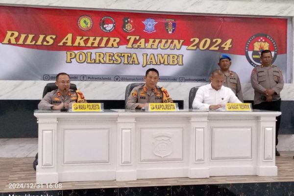 Tajam24Jam.com – Jambi 31 Desember 2025, Dalam rangka untuk mempublikasikan hasil kinerja anggotanya selama tahun 2024 Kapolresta Jambi Kombes Pol Eko Wahyudi yang didampingi Wakapolresta Jambi AKBP Nurhadiansyah dan Kasat Reskrim Kompol Marhara Tua Siregar. Hadir juga Kasi Humas Ipda Deddy.Dalam kegiatan tersebut Kapolresta Jambi menyampaikan kasus Curat, Curas, curanmor, dan tindak pinana kriminallitas lainnya diwilayanh hukum Polresta Jambi kalau dibandingkan dengan tahun 2023 lalu, rata-rata menurun di tahun 2024. Ujarnya. Kapolresta Jambi Eko Wahyudi juga menyampaikan beberapa himbauan kepada masyarakat yang akan merayakan pergantian malam tahun 2024 ke tahun 2025. Salah satu yang ditekankan Kapolresta Jambi yakni, agar masyarakat tetap menjaga kerukunan dan toleransi antar umat beragama. Selain itu, Eko Wahyudi meminta warga yang hendak turut merayakan malam tahun baru, sebelum bepergian sebaiknya mengecek kondisi rumah dan mematikan aliran listrik.“Yang ketiga selalu menjaga kerukunan dan toleransi antar umat beragama, sebagai wujud persatuan dan kebersamaan. Yang keempat hindari penggunaan petasan, kembang api yang dapat merugikan diri sendiri dan orang lain. Yang kelima dilarang melakukan pesta miras (minuman keras) ataupun narkoba.”“Yang terakhir, kami mengharapkan menjelang malam pergantian tahun tidak melakukan konvoi dan ugal-ugalan, serta menggunakan knalpot brong yang dapat mengganggu ketertiban masyarakat.”“Kami punya slogan ‘Mari bersama wujudkan perayaan malam Natal dan tahun baru yang aman, sejuk dan kondusif’,” tegas Kapolresta Jambi.Di penghujung penyampaian rilisnya, Eko Wahyudi ditanya wartawan terkait harapannya di tahun 2025 bagi Polresta Jambi. Pertanyaan itu dilontarkan karena tak lama lagi Eko Wahyudi akan pindah tugas dalam rangka pendidikan.Baginya, situasi Kamtibmas yang kondusif tak lepas dari peran serta semua lapisan masyarakat bahkan peran pers di Jambi.“Harapan, Saya percaya Polresta Jambi lebih solid lagi dan menjaga kamtibmas kota Jambi. Tentunya tidak lepas dari peran serta rekan-rekan media semua. Ungkapnya. Penulis Team.
