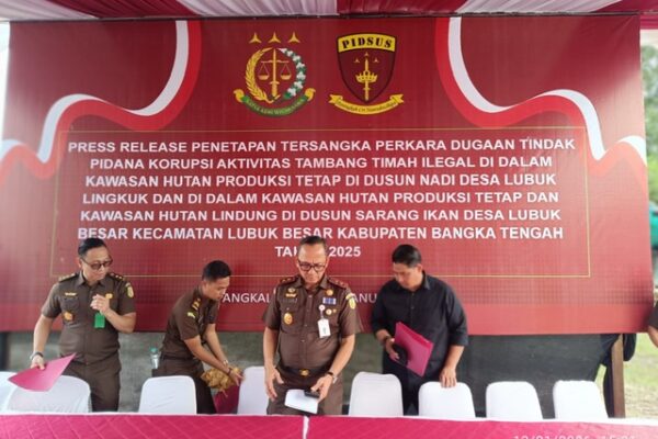 Tajam24Jam.Com Pangkalpinang, 13 Januari 2026 — Kejaksaan Tinggi Kepulauan Bangka Belitung (Kejati Babel) menetapkan empat orang tersangka dalam perkara dugaan tindak pidana korupsi kegiatan penambangan timah ilegal di wilayah Kabupaten Bangka Tengah. Penetapan tersangka dilakukan setelah tim Jaksa Penyidik Bidang Tindak Pidana Khusus memperoleh alat bukti yang cukup. Kasus ini terjadi pada Tahun 2025 di Kawasan Hutan Produksi Tetap (HP) Dusun Nadi, Desa Lubuk Lingkuk, serta Kawasan Hutan Lindung (HL) Dusun Sarang Ikan, Desa Lubuk Besar, Kecamatan Lubuk Besar. Keempat tersangka tersebut masing-masing berinisial HF, YYH, IS, dan M, dengan peran yang saling berkaitan dalam praktik penambangan timah tanpa izin. Tersangka YYH dan IS berperan sebagai pelaku langsung kegiatan penambangan ilegal di kawasan HP dan HL. Sementara itu, tersangka HF diketahui bekerja sama dengan keduanya dengan menyiapkan alat berat, menampung hasil penambangan ilegal, serta menjualnya melalui saksi bernama Melvin Edlyn. HF juga bertindak sebagai pengendali dan koordinator penggunaan alat berat dalam aktivitas penambangan ilegal tersebut. Adapun tersangka M, yang merupakan Aparatur Sipil Negara (ASN) sekaligus Kepala KPHP Sungai Sembulan, diduga melakukan pembiaran atas aktivitas penambangan ilegal serta memanipulasi laporan patroli, sehingga seolah-olah tidak pernah terjadi kegiatan ilegal di kawasan hutan tersebut. Terhadap para tersangka, penyidik Kejati Babel telah melakukan penahanan di Rumah Tahanan Negara (Rutan) Lembaga Pemasyarakatan Kelas IIA Pangkalpinang selama 20 hari, terhitung sejak 12 Januari 2026 hingga 31 Januari 2026. Dalam penyidikan sementara, kerugian keuangan negara akibat aktivitas penambangan timah ilegal ini diperkirakan mencapai Rp 89.701.442.371. Namun, untuk memastikan keakuratan nilai kerugian negara, penyidik masih berkoordinasi secara intensif dengan Badan Pengawasan Keuangan dan Pembangunan (BPKP). Para tersangka dijerat dengan ketentuan hukum, antara lain: Primair: Pasal 803 Undang-Undang Nomor 1 Tahun 2023 jo. Pasal 18 Undang-Undang Nomor 31 Tahun 1999 sebagaimana diubah dengan Undang-Undang Nomor 20 Tahun 2001 jo. Pasal 20 Undang-Undang Nomor 1 Tahun 2023 tentang Kitab Undang-Undang Hukum Pidana (KUHP). Subsidiair: Pasal 604 Undang-Undang Nomor 1 Tahun 2023 jo. Pasal 18 Undang-Undang Nomor 31 Tahun 1999 sebagaimana diubah dengan Undang-Undang Nomor 20 Tahun 2001 jo. Pasal 20 Undang-Undang Nomor 1 Tahun 2023 tentang KUHP. Dalam perkara ini, penyidik juga telah melakukan penyitaan sejumlah barang bukti, antara lain 14 unit alat berat, 2 unit bulldozer, berbagai peralatan pendukung penambangan, serta dokumen dan barang bukti lain yang berkaitan langsung dengan tindak pidana tersebut. Seluruh barang bukti kini telah diamankan guna kepentingan pembuktian dalam proses penegakan hukum selanjutnya. Penulis Tim