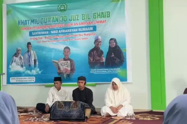 Tajam24Jam.Com Muaro Jambi, 20 September 2025 – Pondok Pesantren Tahfidz Qur’an Amanah Ummat menggelar acara Tasyakuran Khotmil Qur’an 30 Juz, Sabtu (20/9) pagi, di Masjid halaman pondok. Kegiatan ini menjadi momen bersejarah sekaligus ajang apresiasi bagi santri yang berhasil menuntaskan hafalan Al-Qur’an 30 Juz. Acara berlangsung khidmat dengan kehadiran para orang tua khotimin, jajaran pengajar, serta seluruh santri. Para santri menampilkan hafalan mereka secara langsung di hadapan tamu undangan, sebelum dilanjutkan dengan sambutan pimpinan pondok. Ustadz Nizomil Khoiri, S.Ag, Alhafizh, selaku pimpinan Pondok Pesantren Amanah Ummat, menyampaikan rasa syukur atas keberhasilan program tahfidz yang telah dijalankan. “Kami terus berusaha meningkatkan kualitas tahfidz dengan menghadirkan guru-guru penghafal 30 juz agar program ini semakin berkembang,” ujarnya. Sementara itu, Hamzan, orang tua salah satu khotimin, Niko Apriansyah Nurham, mengungkapkan rasa bangga dan haru. “Berkat bimbingan tulus dari para guru, anak kami bisa menyelesaikan hafalan 30 juz. Ini berkah yang luar biasa,” katanya. Kegiatan ini tidak hanya menjadi bentuk apresiasi, tetapi juga motivasi bagi seluruh santri untuk terus berusaha mengkhatamkan Al-Qur’an. Pondok Pesantren Amanah Ummat berharap keberhasilan angkatan pertama ini menjadi pijakan untuk melahirkan generasi penghafal Al-Qur’an yang cerdas dan berakhlak mulia. Acara ditutup dengan doa bersama, penuh harapan agar para santri istiqamah menjaga hafalan dan mampu menjadi teladan di tengah masyarakat. Penulis Tim