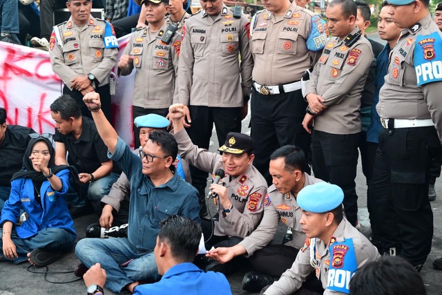 Menanggapi hal tersebut, Wakapolda Jambi bersama jajaran PJU turun langsung dan duduk bersama pendemo di jalan untuk berdialog dengan massa aksi.